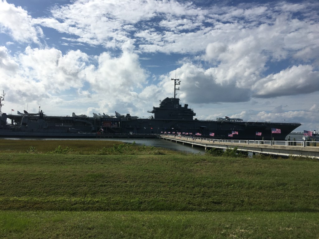I knew that this stop meant there was a lot of history to see, but this is like a center point in history. Fort Moultrie on Sullivan Island was under construction in June 1776 when it was attacked by the British and it still forced their retreat. After the war, it ended up abandoned. The fort was rebuilt in the 1790s and again in the 1880s as other wars erupted. It last saw duty when Pearl Harbor was attacked in 1941, but after WWII, it was left abandoned one last time. It has since been restored and is a historic place and museum. Leaving Sullivan Island, we stopped at Patriots Point where we toured a destroyer, a submarine, and the the USS Yorktown, an aircraft carrier. A great deal of each ship is open for the tour – engine room, control room, radio room, CIC, and the flight deck of a carrier. Just trying to think of how many planes took off and landed on that deck blows you away. Many types of those many planes are on display either on the flight deck or below decks, including my favorite, the Corsair F4U. For the sub, you enter thru the forward torpedo room and exit thru the aft torpedo room. Along the route, you pass thru about eight watertight bulkhead doors that were about 36″ high and 24″ wide. These were fun getting thru!