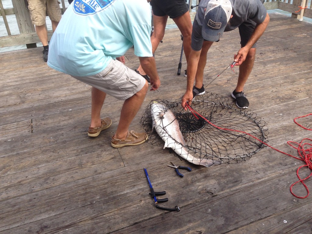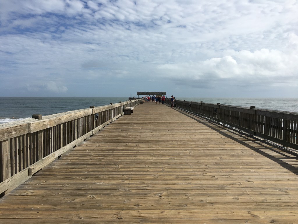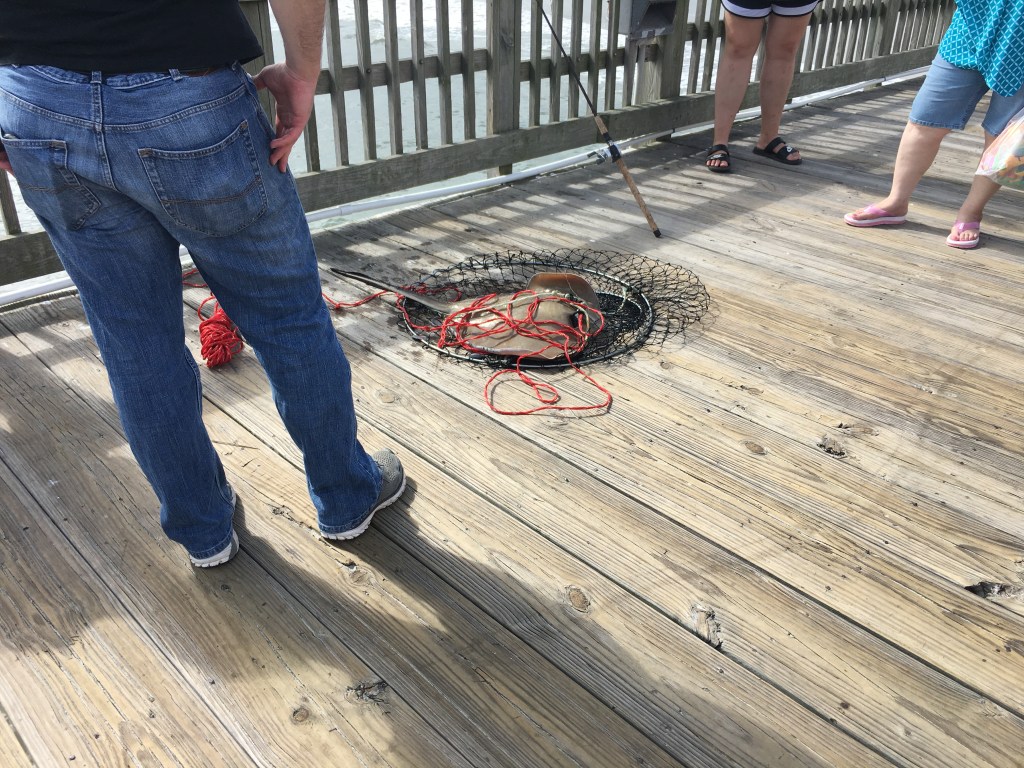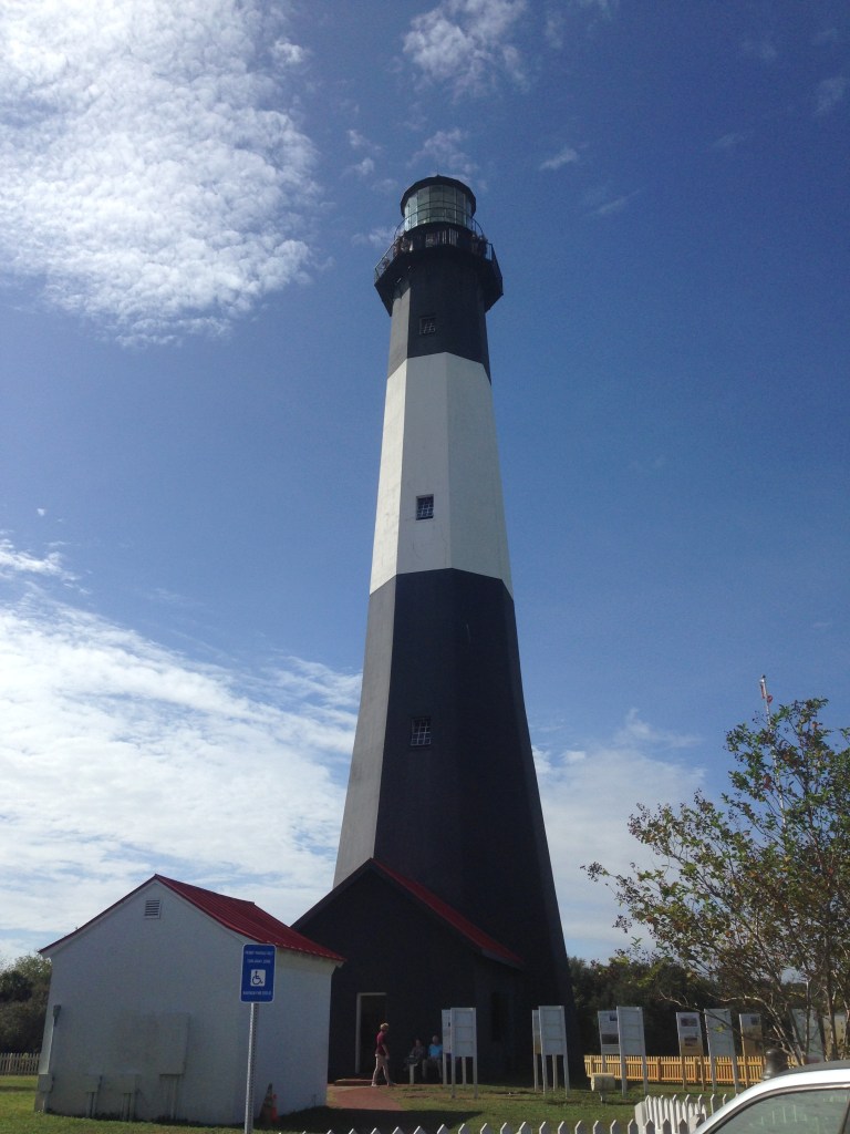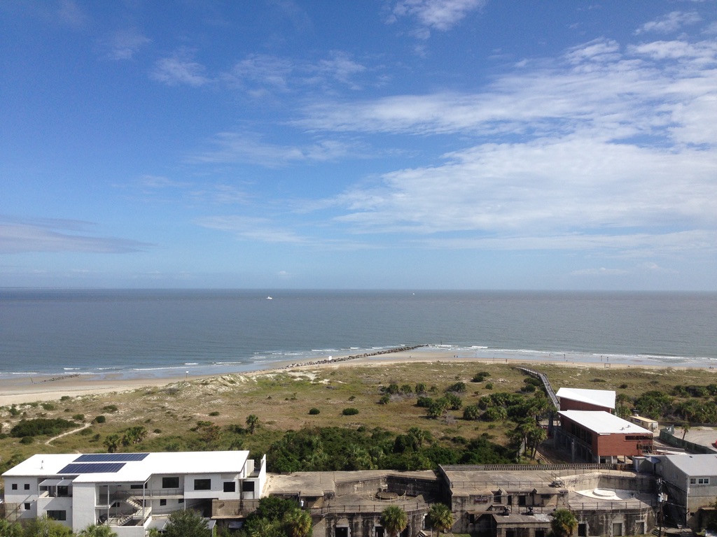 Tybee Island is a barrier island with a lot of history and great beaches. We stopped at the Light Station on the way in. Built in 1773 and rebuilt, it has guided many ships into the area. Fun fact: the colored stripes identify this lighthouse so sailors know where they are. We climbed to the top, all 178 steps, to see the incredible view. A picture below shows not only the view, but the battery below that is now a museum for the lighthouse. Afterwards, we drifted down to the other end of the island to the Tybee Beach Pier. Although great views can be found here, the real fun is fishing! The first catch while we were there was a stingray! A good two foot across, after resting for a few minutes, the hook was removed and the fish was released. Next catch was a bluefish also at about 24 inches. Must have been just under the minimum as after several measurements, he also was released. We had a seafood snack and then checked out the little shops.