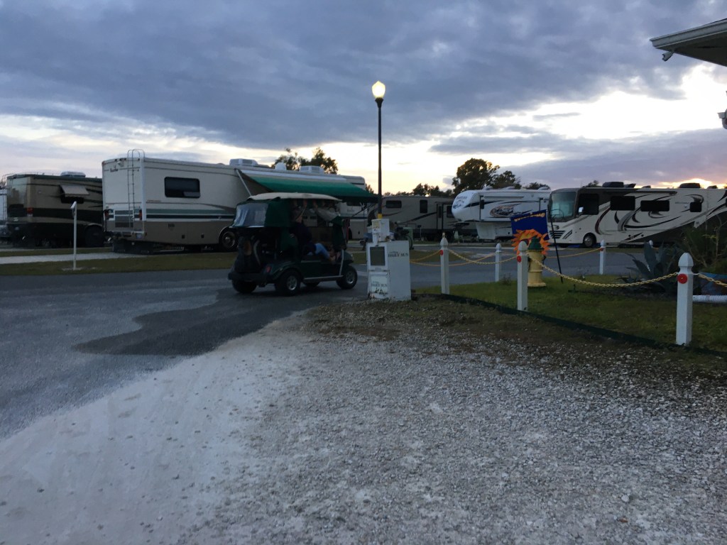It’s GEEZERS IN GOLFCARTS ! ! ! Our second of four stops here in Florida was in Summerfield, a little town between Ocala and Orlando. Just south of here is an area called The Villages which is a collection of retirement parks. Some are townhouses while a lot of them are prefabs (mobile homes), but they almost all have at least one golf cart in the driveway. This is the preferred method of travel here and there are paved paths that link them to one another and also to the shopping centers, medical centers, and recreation areas. There are even bridges across the main route thru here made just for these carts. Most businesses have separate parking for carts usually right in front of the door. And although you always see cars stop for pedestrians, you will never see a cart stop. So if you visit this area, be warned, they are silent and deadly, half blind and hard of hearing. Good luck.