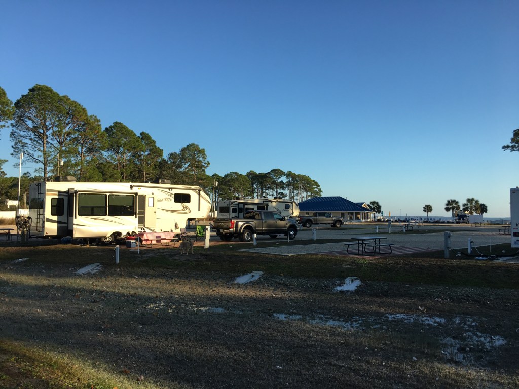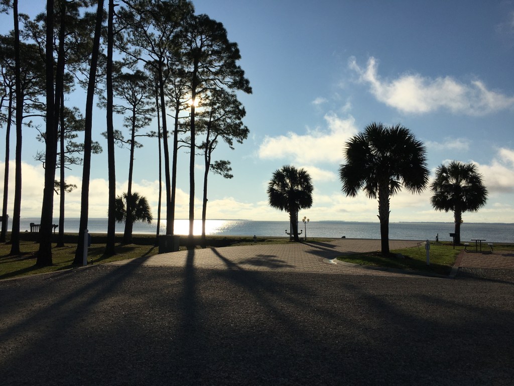 We arrived safely in Eastpoint, Florida on Friday the 13th. The drive took about four and a half hours and was uneventful, but we had fog almost all the way here. Met up with my niece Armida (she lives just west of our resort in Apalachicola) for dinner and drinks. We went back to the rv to relax and had a rather nasty thunderstorm roll thru, but the rest of the night was quiet. The next morning we awoke to a glorious sunrise over the Apalachicola Bay. Out in the distance in the picture below, you can just make out the barrier island St George Island, and we will be exploring there tomorrow. As a result of the oil spill years ago, the shrimp and oyster business has all but died. The area continues to grow again as a retirement area with restaurants and bars and an endless string of parties, festivals, music, plus all the outdoor activities like hiking, shell hunting, fishing, or just sitting on the beach letting the gulf take away all your stress.
