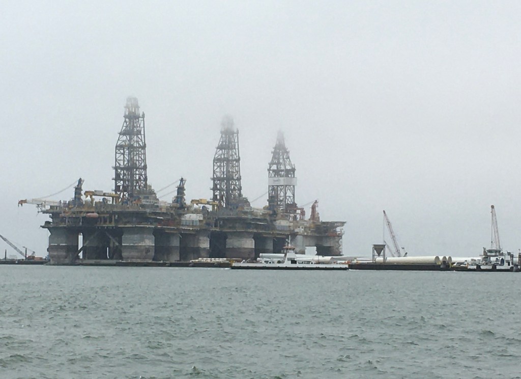 Oil rigs at Port Aransas – a ferry passing by in front