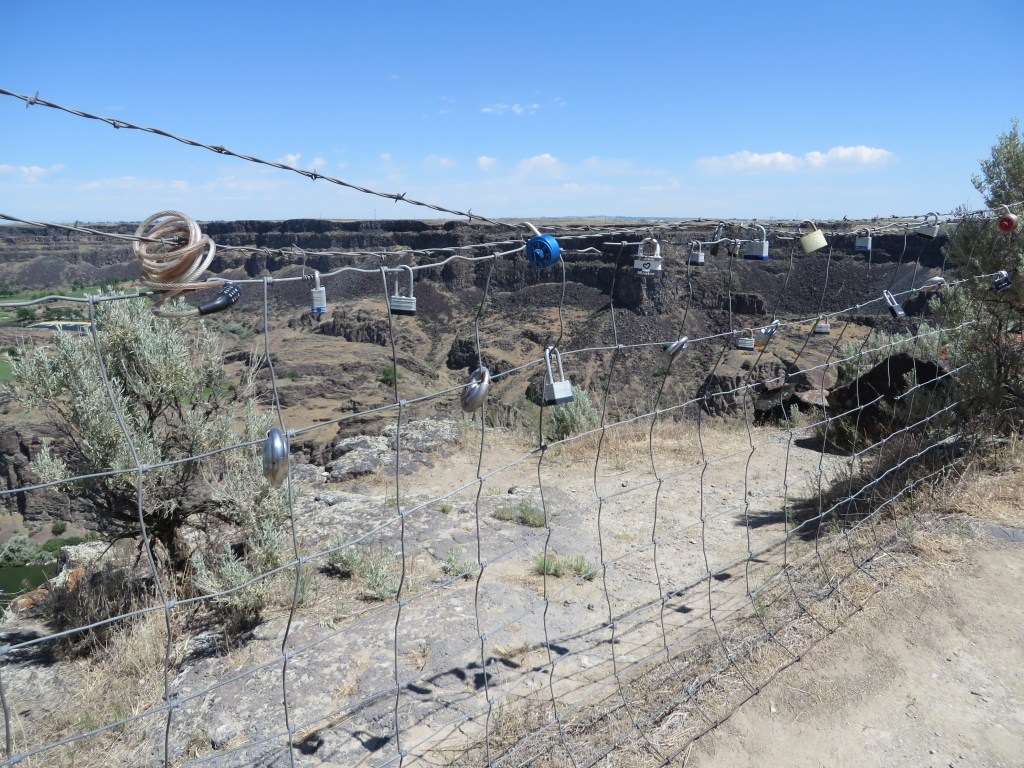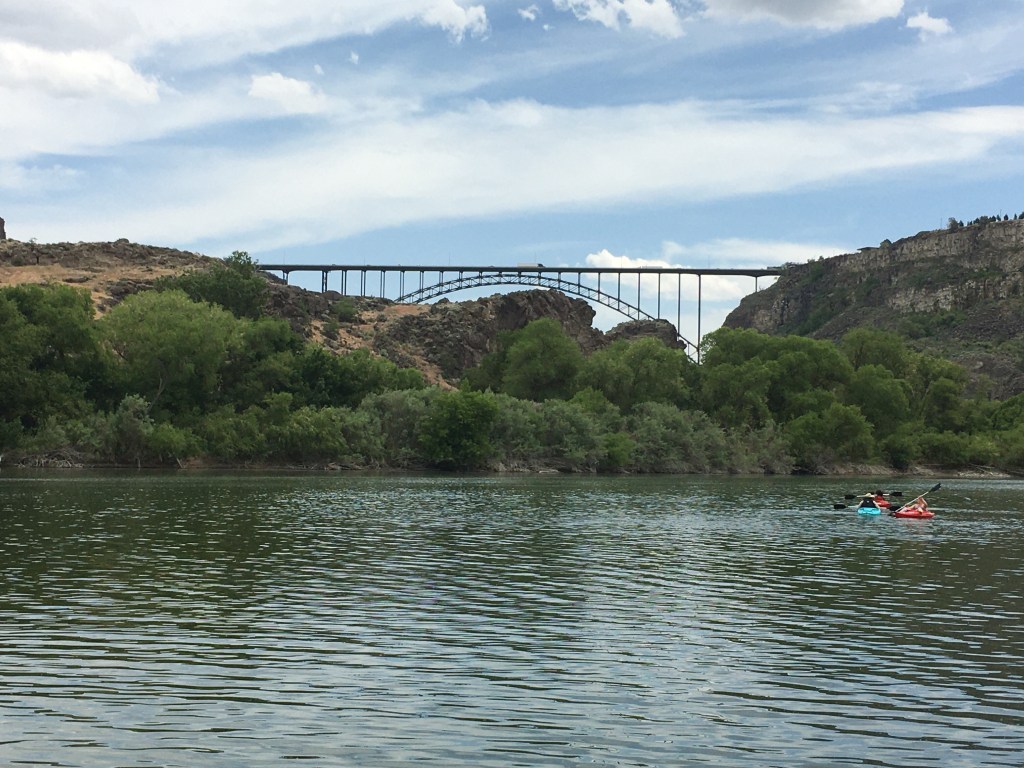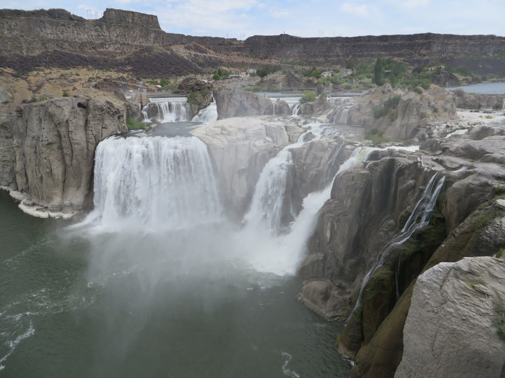Here by the Snake River Canyon, the water drops quite a distance in a series of waterfalls. The namesake falls are several miles upstream, but it was reduced to a single fall when the Milner hydro dam was built just upstream. Between the city and Twin Falls is Shoshone Falls, a spectacular site where the falls are higher than those at Niagra Falls. And just to the west of Shoshone lies the place where Evel Knievel attempted to fly across the canyon on a rocket powered cycle in 1974. After investing over a million dollars, his attempt failed. And just a few miles west of the jump site is the Perrine Bridge, where Route 93 connects I-84 to the city of Twin Falls. You can park at the visitors center at the bridge and take a walk along the Canyon Rim Trail for some beautiful pictures.