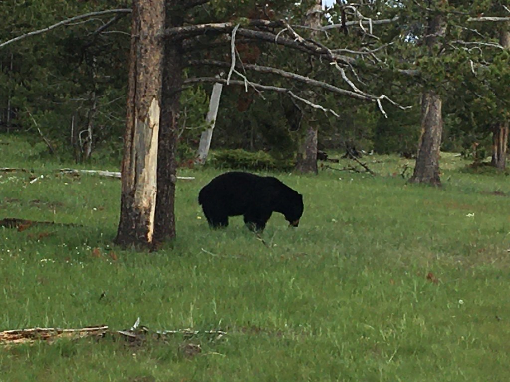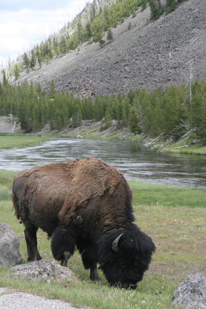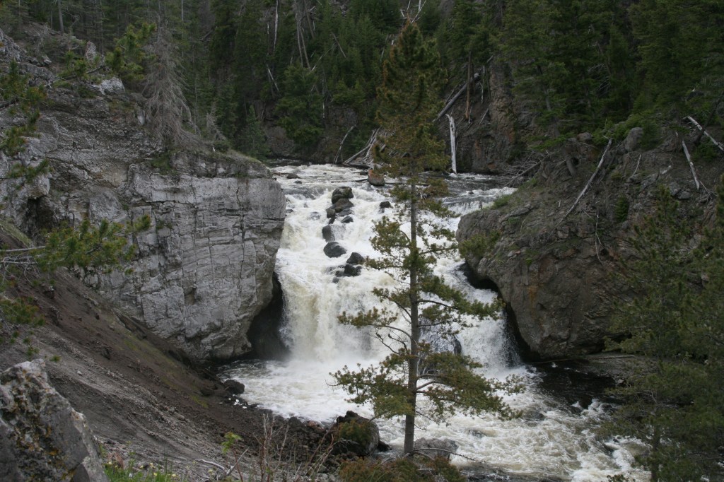 In the center of Yellowstone is the caldera, the crater left by the volcano some 600 centuries ago. The Hayden Valley is in the northeast corner of the caldera and is home to many of the 5000 bison in the park. One picture below is of a herd of bison crossing a creek in the valley with hot springs in the distance. Many trees in the park have bark rubbed off from the bears and deer. Mammoth Hot Springs, on the north edge of the park is a collection of hot springs that have moved the limestone into constantly changing shapes of travertine. Also, the area here, just north of the Teton range, is mountainous. As the snow on the peaks melts, there is a lot of water coming down in creeks and rivers dropping in elevation fast enough to form rapids and water falls all thru the park.