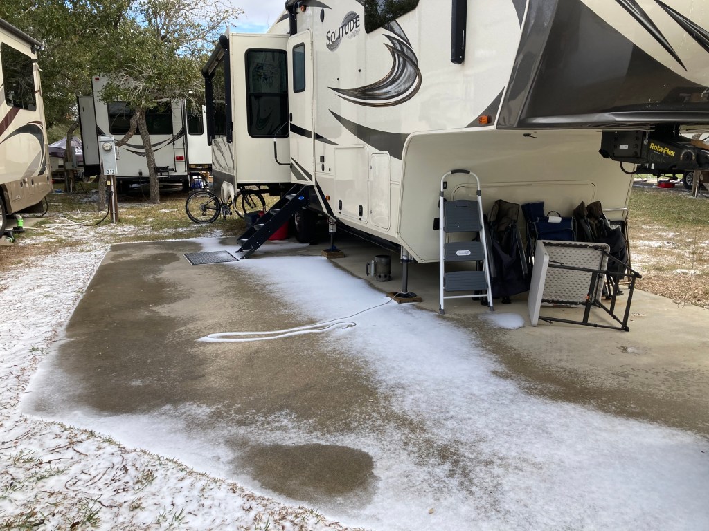 What’s funny about that post is 70 – 71 degrees is the NORMAL temperature for this time of year. One week ago, heaven turned into hell! For several days, the highs hovered around 34 – 35 wile lows went down to 17. The entire state was hit with snow, ice and temps below 0. There were major pile ups and closed roads. In Rockport, we had some warmer weather, but that 17 degree low burst pipes and caused water shut offs. Never expecting weather not seen in a century, 45 megawatts of power was offline for maintenance and that forced power outages and rolling blackouts. I put a couple days of water into the onboard tank the get thru the coldest night, but that was when we lost all water for four days. We did have power, but below 40 degrees the heat pump stops, so heat was furnace only. That caused 3 trips to get propane in one week. One time at the coldest, the line was three and a half hours long! Today, we are going to hit 60 and the water got turned back on this morning. After breakfast, I have a date with a long, hot shower.